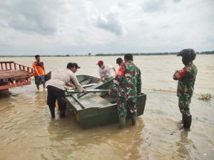 “Dengan seijin Dandim Pati, hari ini satu unit perahu dan mesin tempel kami bawa merapat ke desa Karangrowo kecamatan Jakenan,”ungkap Danramil.